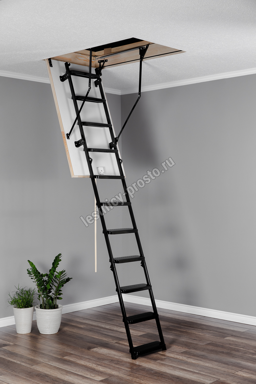 Лестница складная трехсекционная. Рабочая поверхность полностью выполнена из металла и покрашена порошковой краской. Термоизоляционная крышка типа "сэндвич", толщиной 86 мм, утеплена пенопластом, облицована с двух сторон ДCП белого цвета.