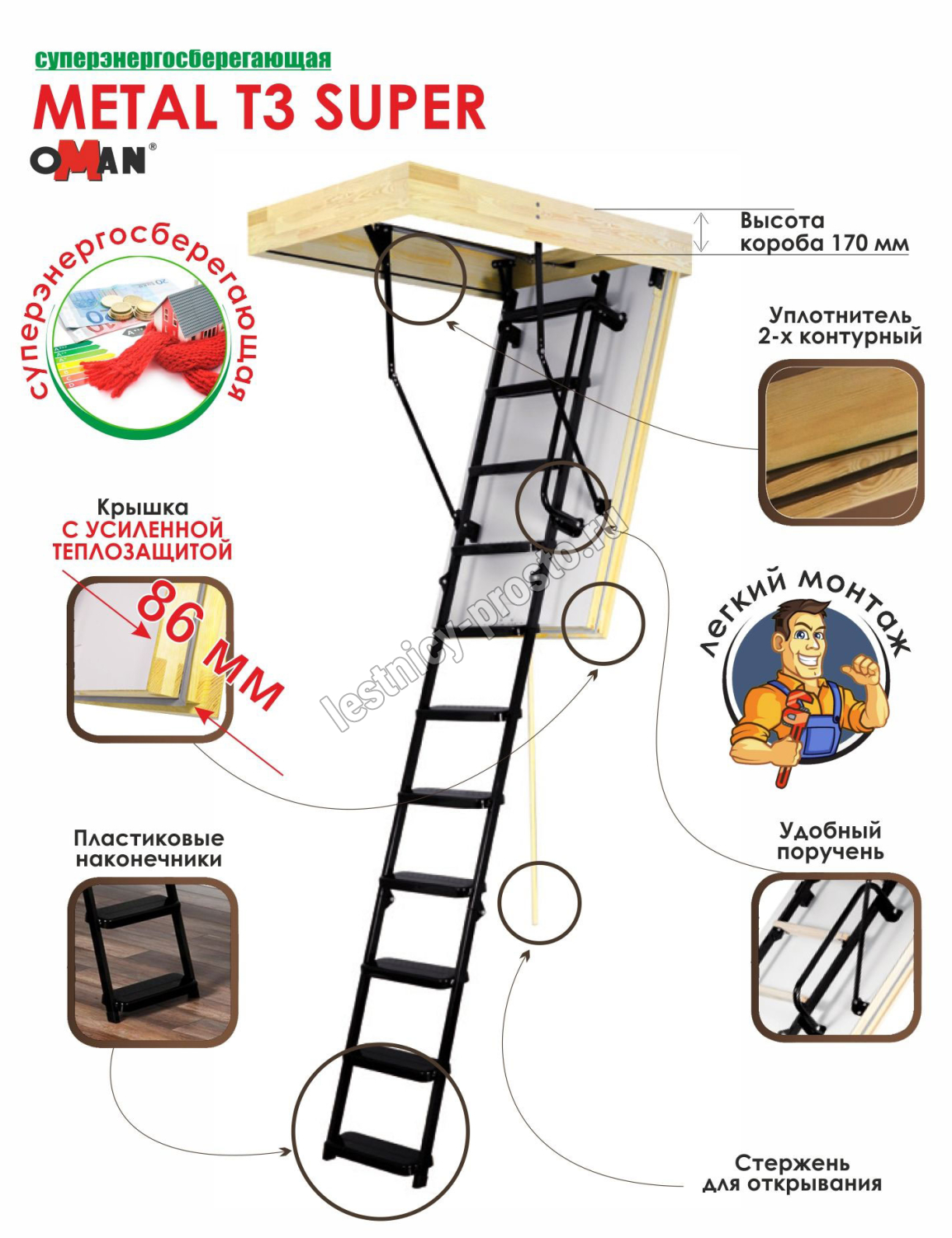Чердачная лестница OMAN Metal T3 SUPER 55×113 см, h-280 см