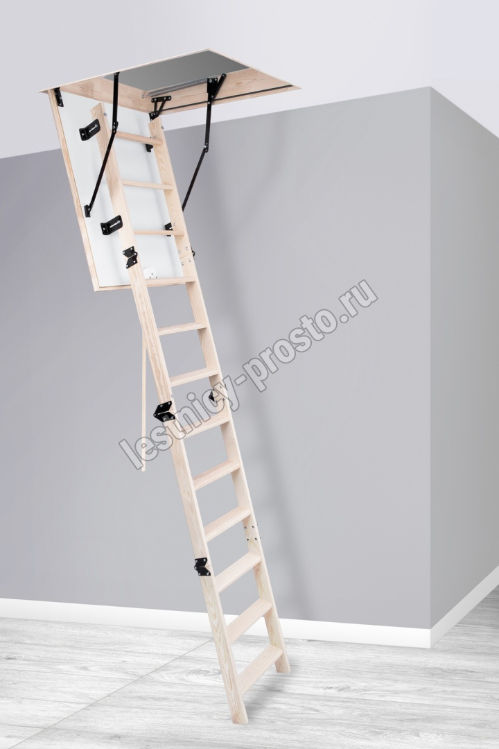 Лестница складная четырехсекционная, изготовлена из массива сосны. Термоизоляционная крышка типа "сэндвич" утеплена пенопластом толщиной 20 мм, облицована с двух сторон ДСП белого цвета.