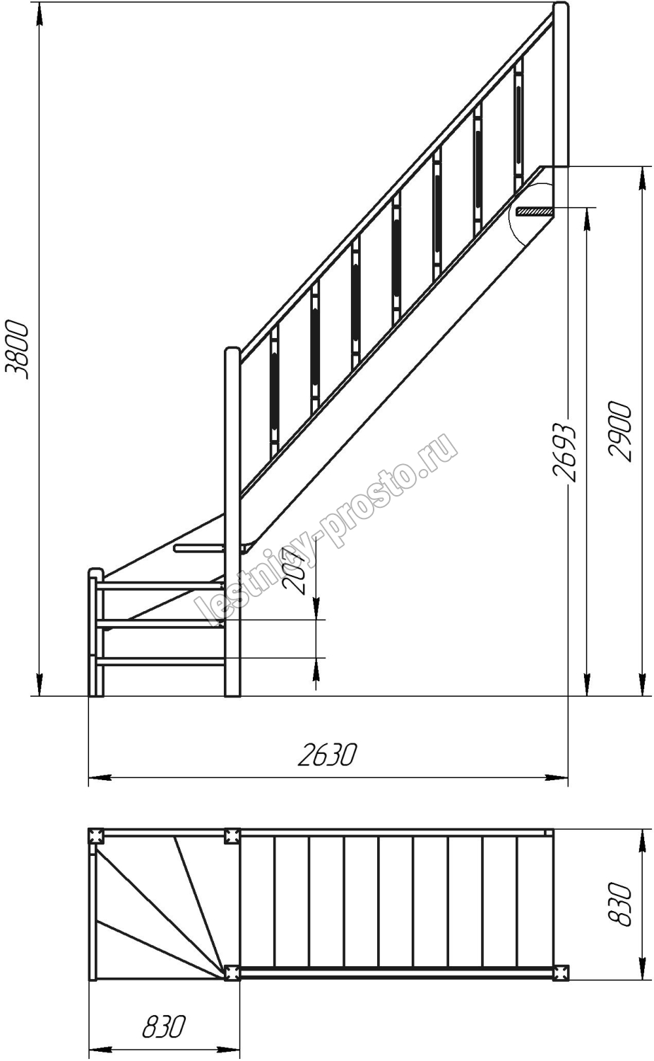 Деревянная межэтажная лестница ЛЕС-07 2693-2900 проем 2550-830, Бук