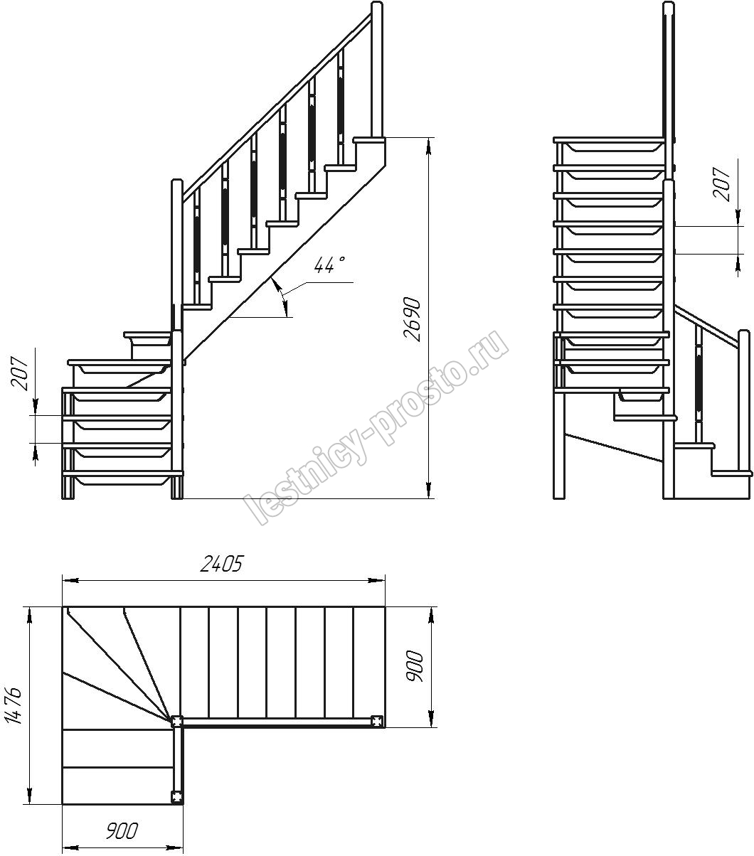 Деревянная межэтажная лестница ЛЕС-09 2690 проем 2405-900, Сосна