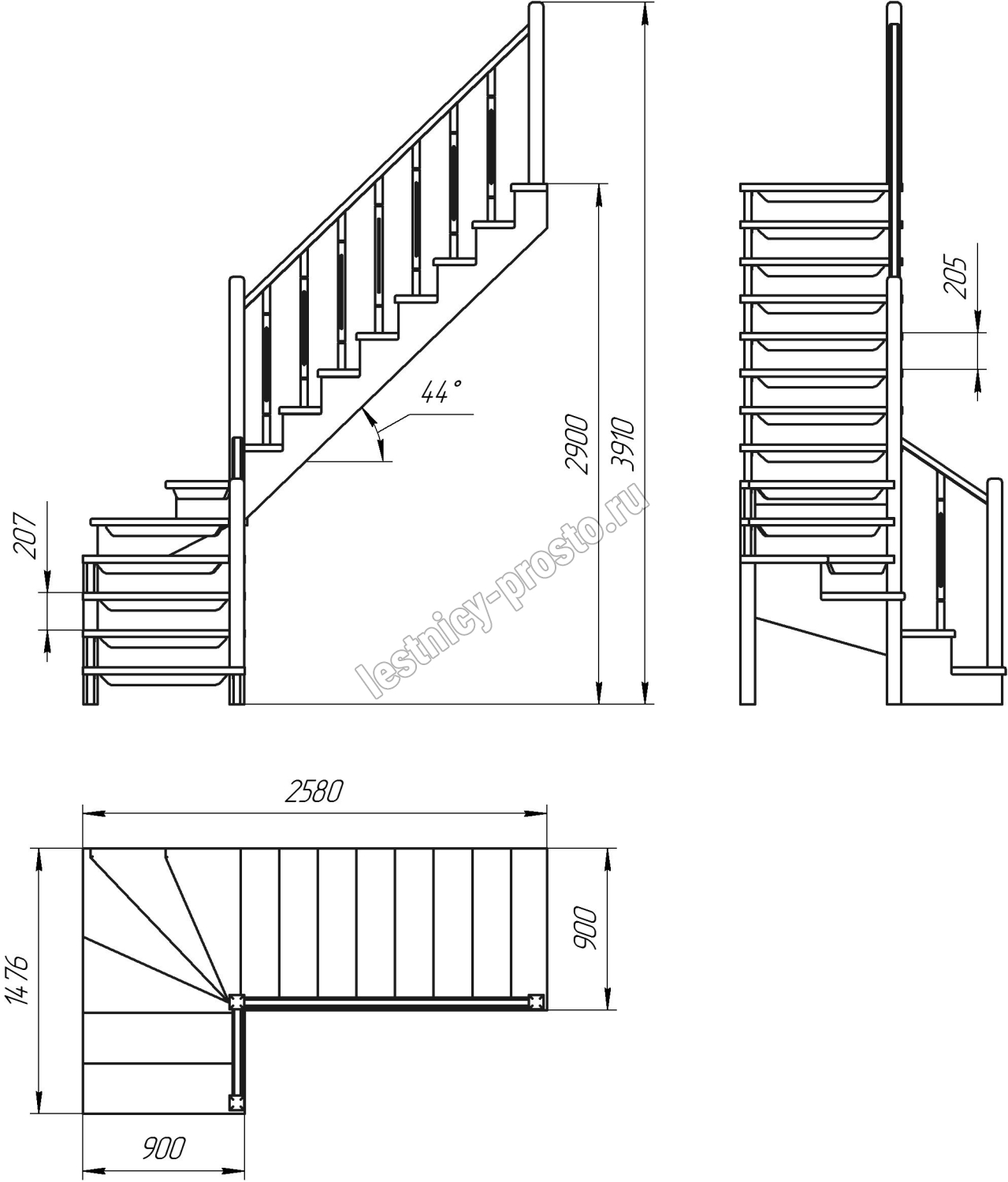 Деревянная межэтажная лестница ЛЕС-09 2900 проем 2580-900, Сосна