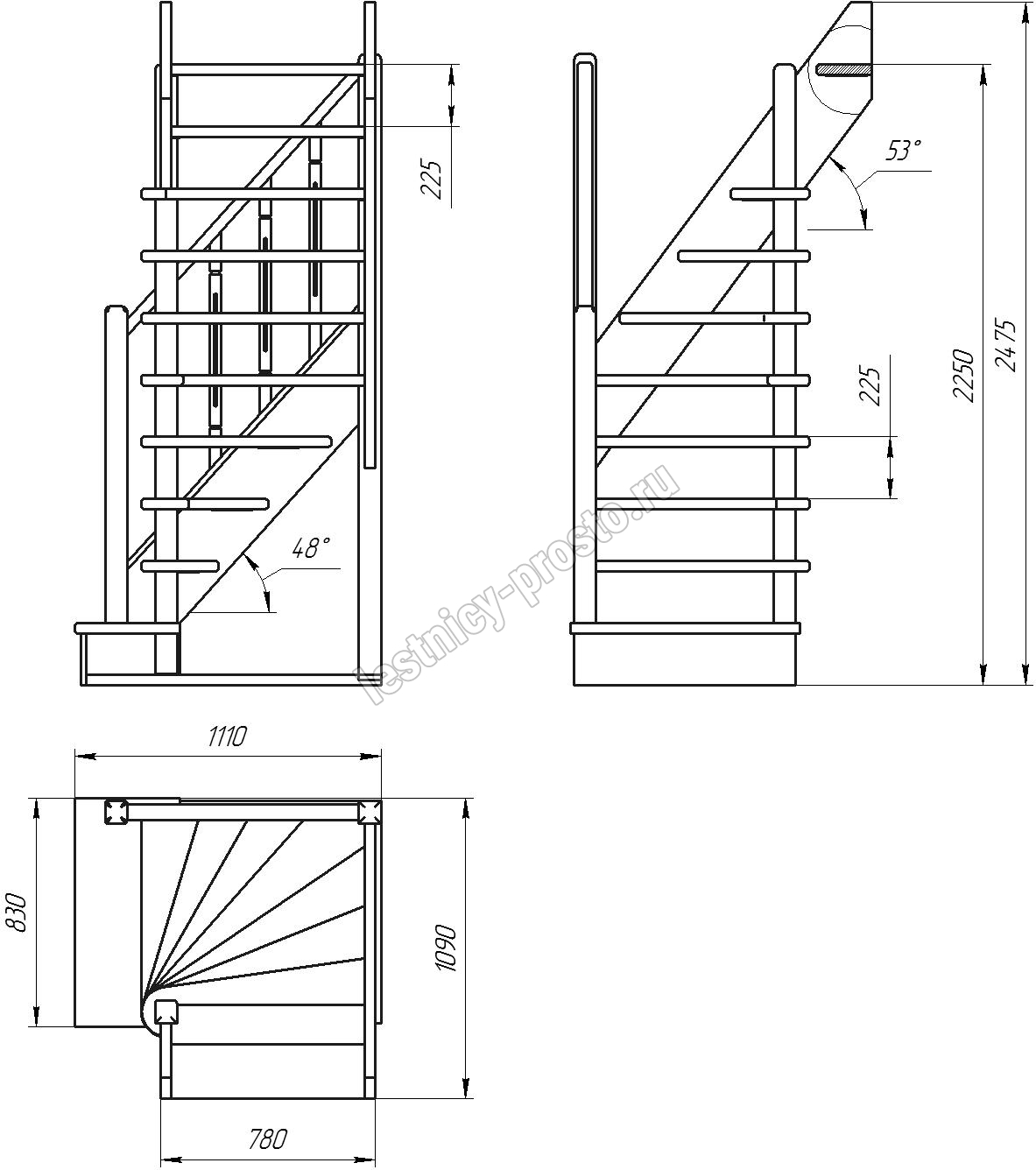 Деревянная межэтажная лестница ЛЕС-91 2250-2475 проем 1090-780, Лиственница