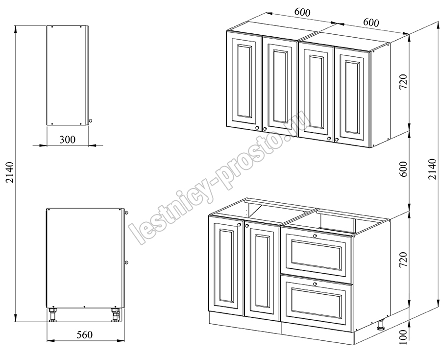 Благодаря модульной системе такая кухня может быть собрана зеркально, а, например, верхние шкафчики "под стекло" и "глухие" заменены местами. В стандартной комплектации нижние тумбы оснащены регулируемыми ножками высотой 100 мм и цоколем из массива сосны высотой 95 мм.