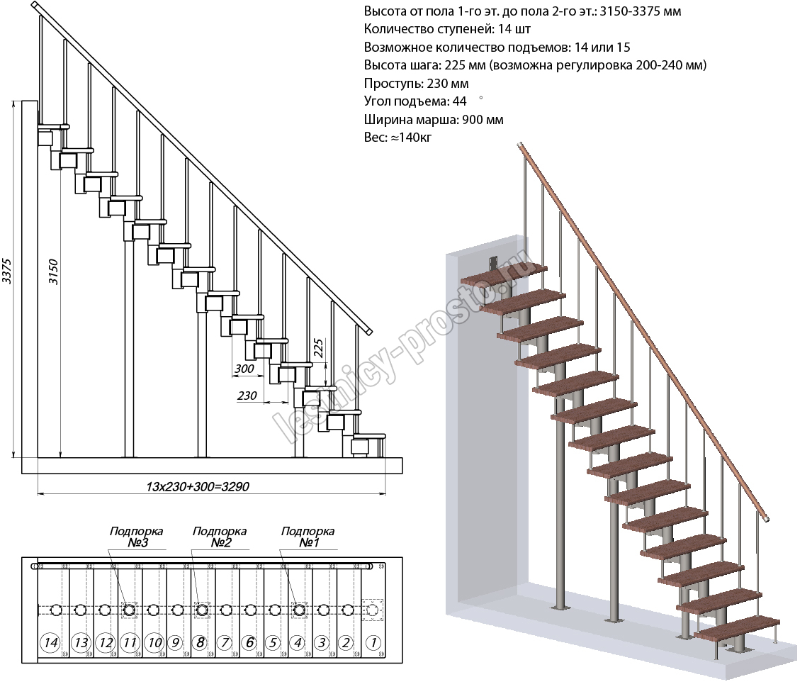 Универсальная, модульная лестница позволяет регулировать высоту шага в диапазоне 200 - 240 мм.