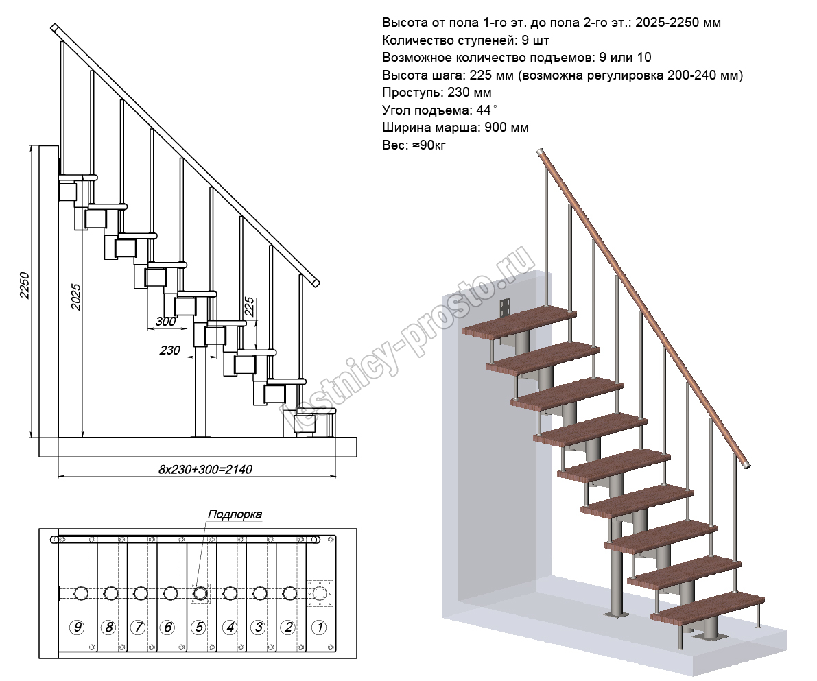 Модульная лестница PROSTO Module прямая/ h202.5 см