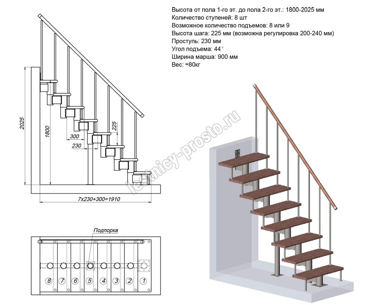 Универсальная, модульная лестница позволяет при сборке регулировать высоту шага в диапазоне  200 - 240 мм.
