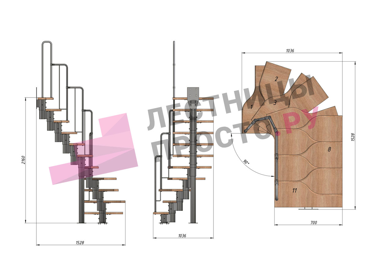 Лестница Prosto Urban Black гусиный шаг 700 мм, h198-288 см (11 ступеней), дуб