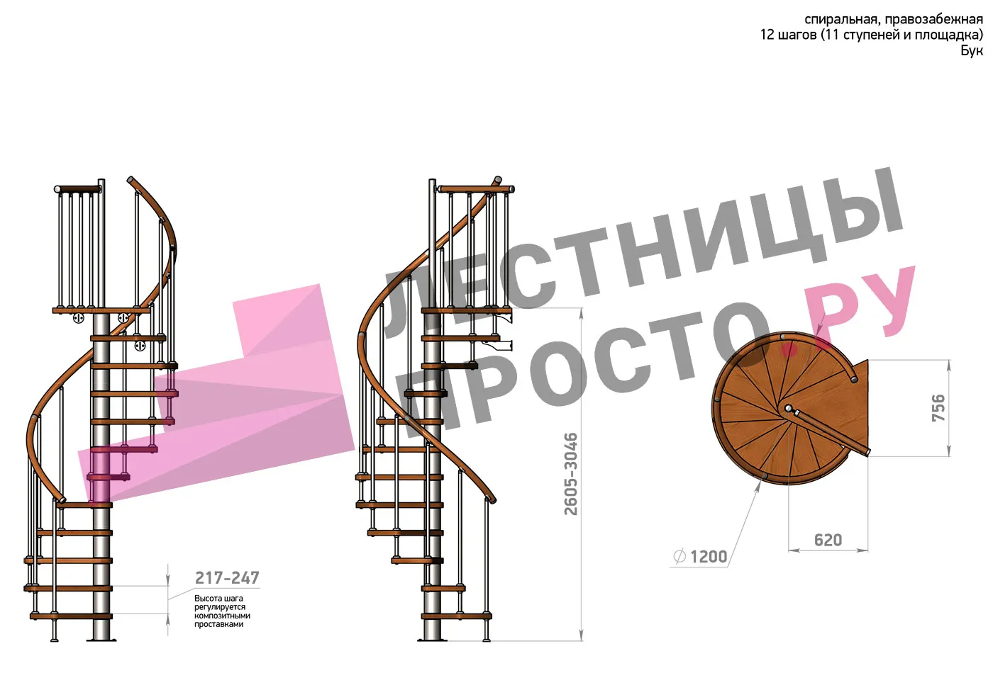 Решение о направлении поворота принимается при сборке - универсальная конструкция позволяет собрать правозабежную и левозабежную лестницы. Высота ступеней регулируется с шагом 3 мм. в пределах 217-247 мм., благодаря чему, лестница прекрасно подгоняется под необходимую высоту.