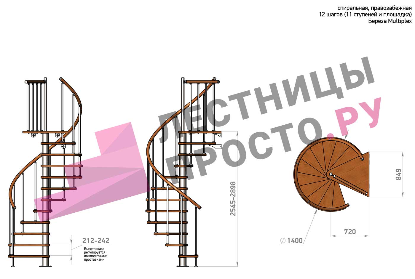 Лестница легко подгоняется по высоте благодаря композитным вставкам в каждом модуле, вариант с 11 ступенями адаптируется под высоту в пределах от 2545 до 2898 мм.