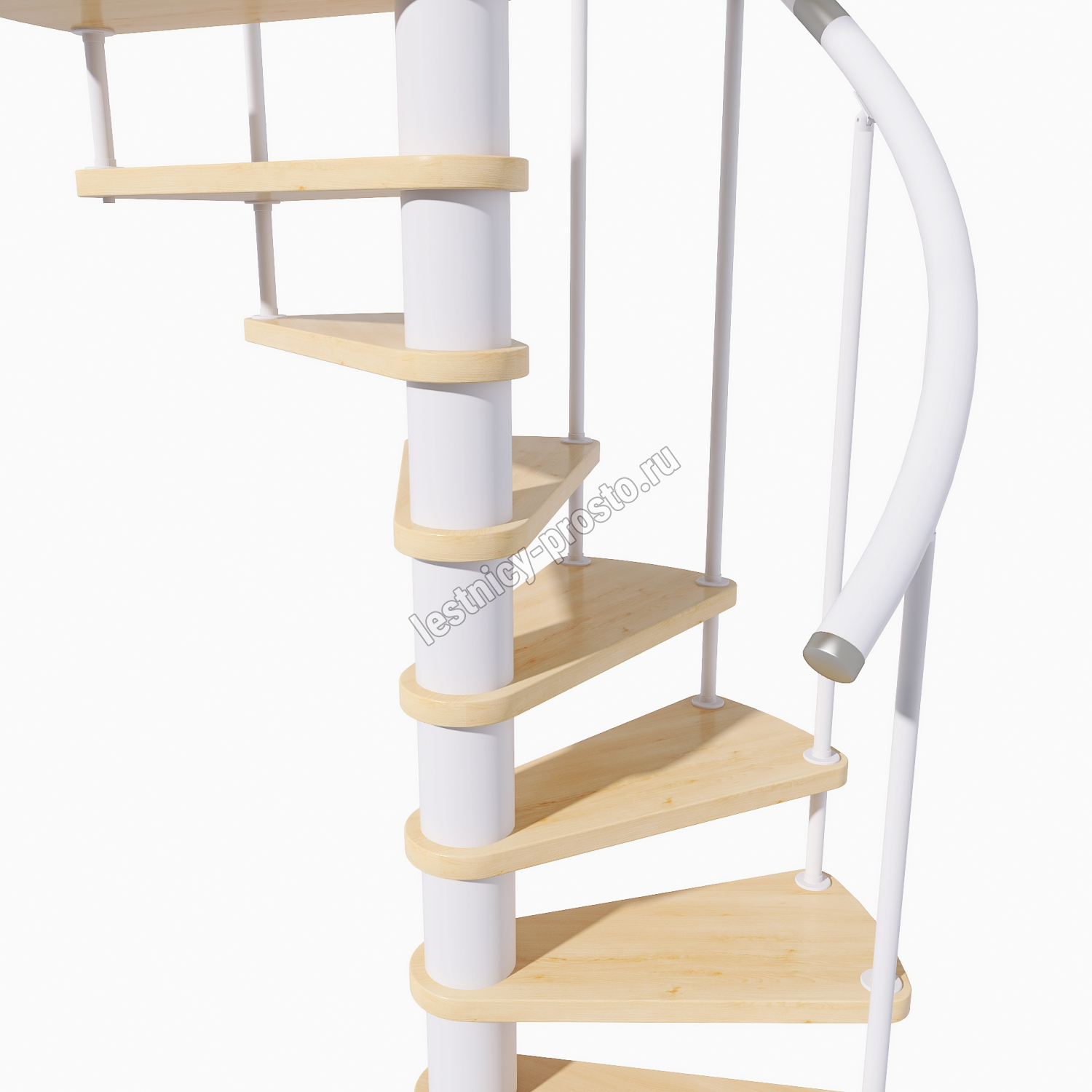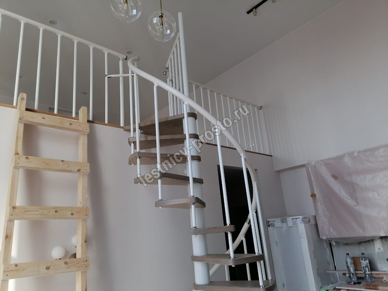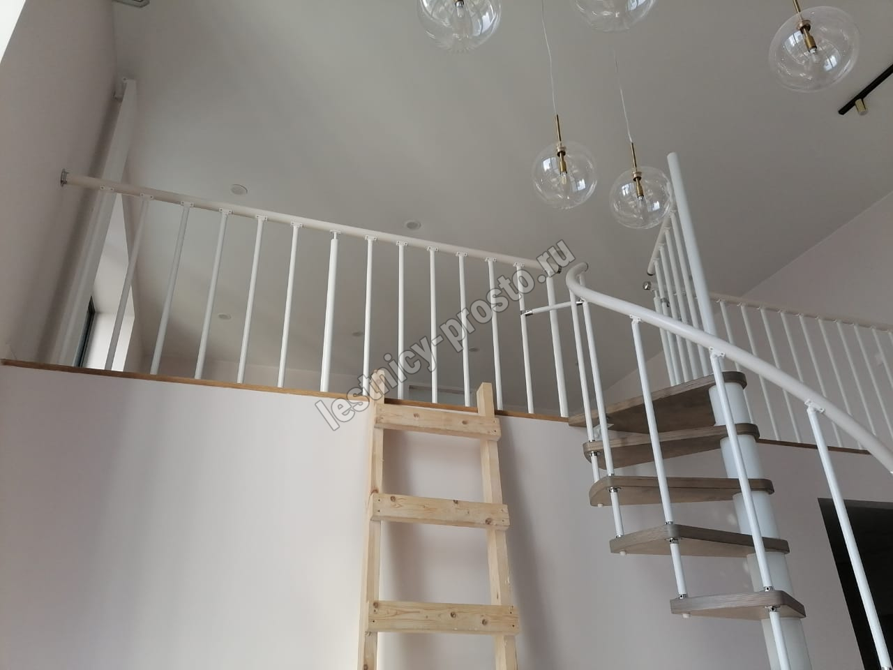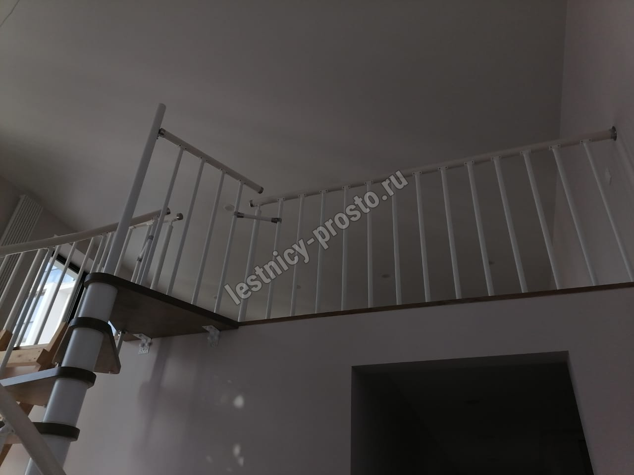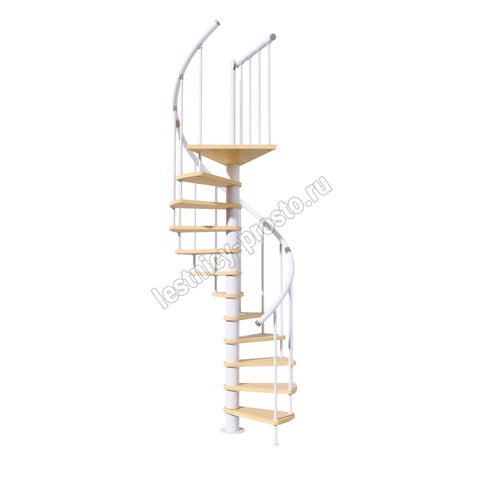 Лаконичная малогабаритная стильная винтовая модульная лестница с белым каркасом.