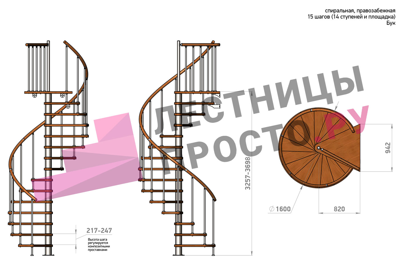 | Винтовая лестница Prosto Spiral White D160см, h260.5-304.6 см, бук |