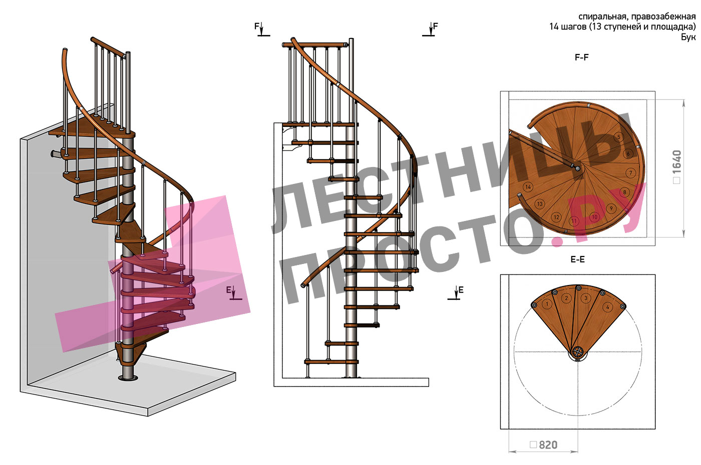 | Винтовая лестница Prosto Spiral White D140см, h325.7-369.8 см, бук |